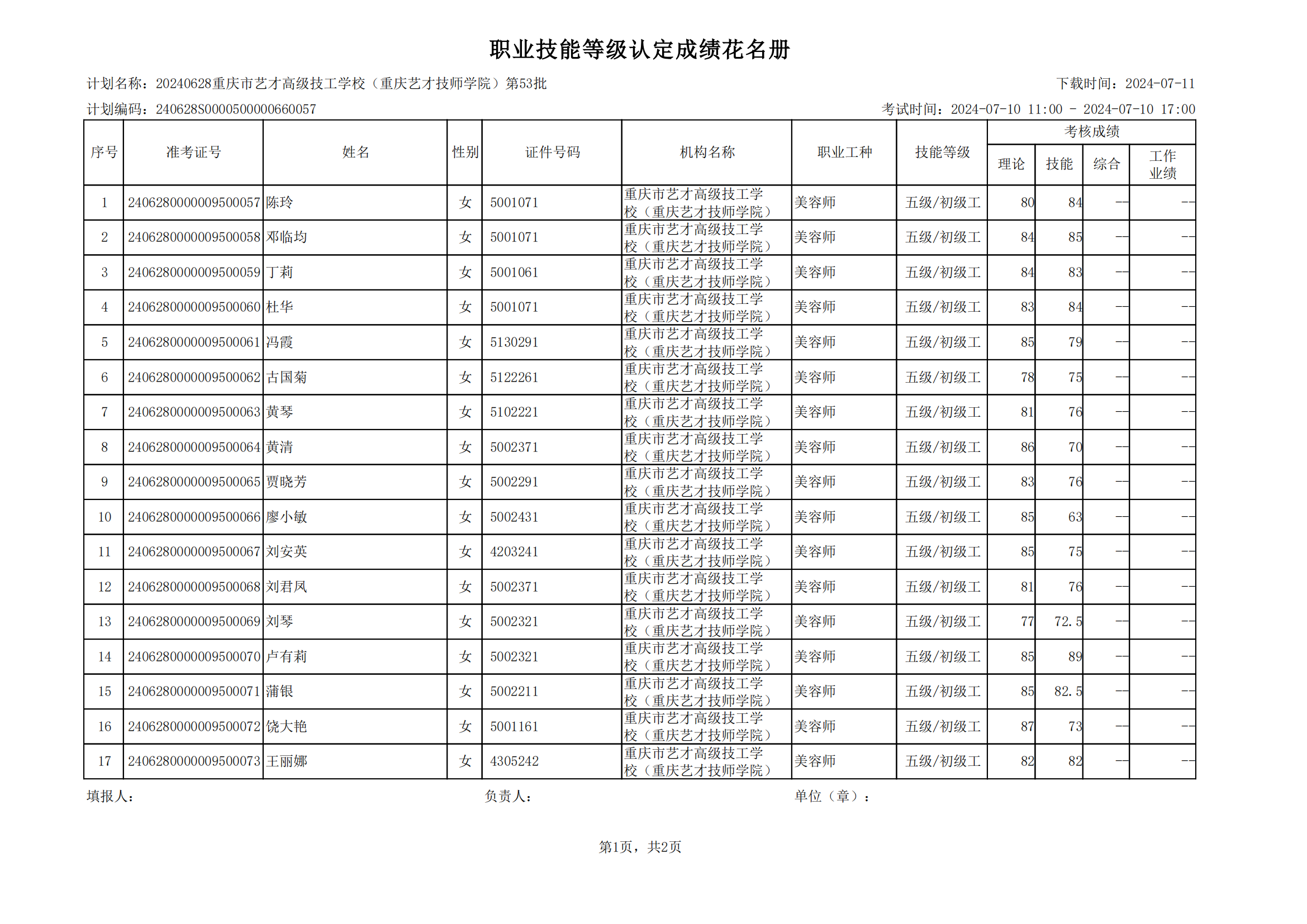 根据《重庆市职业技能等级认定操作指南(试行)》的文件精神,现将2024年第53批次美容师五级考试成绩予以公示,请下载查看